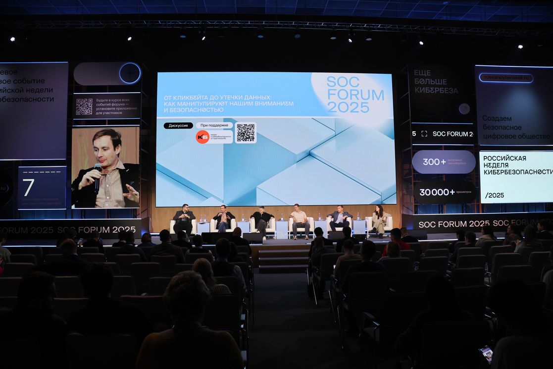 Дискуссия «От кликбейта до утечки данных: как манипулируют нашим вниманием и безопасностью» в рамках SOC Forum была посвящена волне киберфейков — от фальшивых новостей о «взломах» до фиктивных «утечек данных», которые создают атмосферу паники и наносят репутационный и финансовый ущерб компаниям. Модератором сессии выступил Сергей Курьян, основатель АО «Нейросети». В дискуссии также приняли участие Александр Митяев, главный редактор издания «Киберболоид», Кирилл Сидоров, директор по цифровому развитию ТАСС, Анатолий Сулейманов, основатель Telegram-канала Baza, и Александр Вураско, директор по развитию центра мониторинга внешних цифровых угроз Solar AURA (ГК «Солар»). Участники дискуссии их обсудили, как отличить достоверную информацию от спланированной провокации, какие инструменты и источники позволяют сохранять ясность картины происходящего, и какую роль экспертное сообщество может сыграть в противодействии дезинформации.